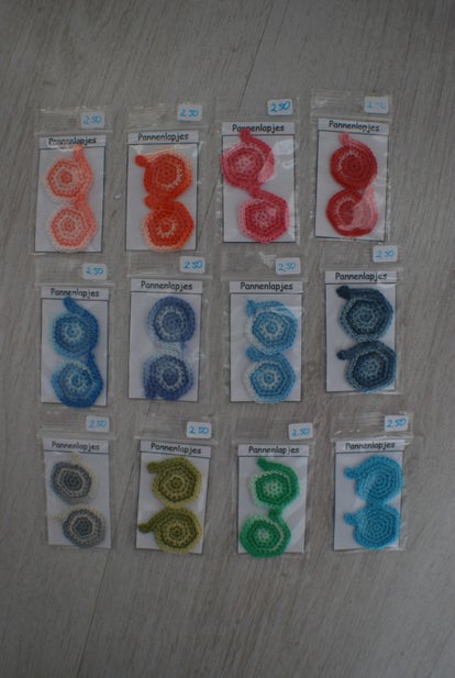 Handgemaakte pannelapjes (gehaakt) per setje.