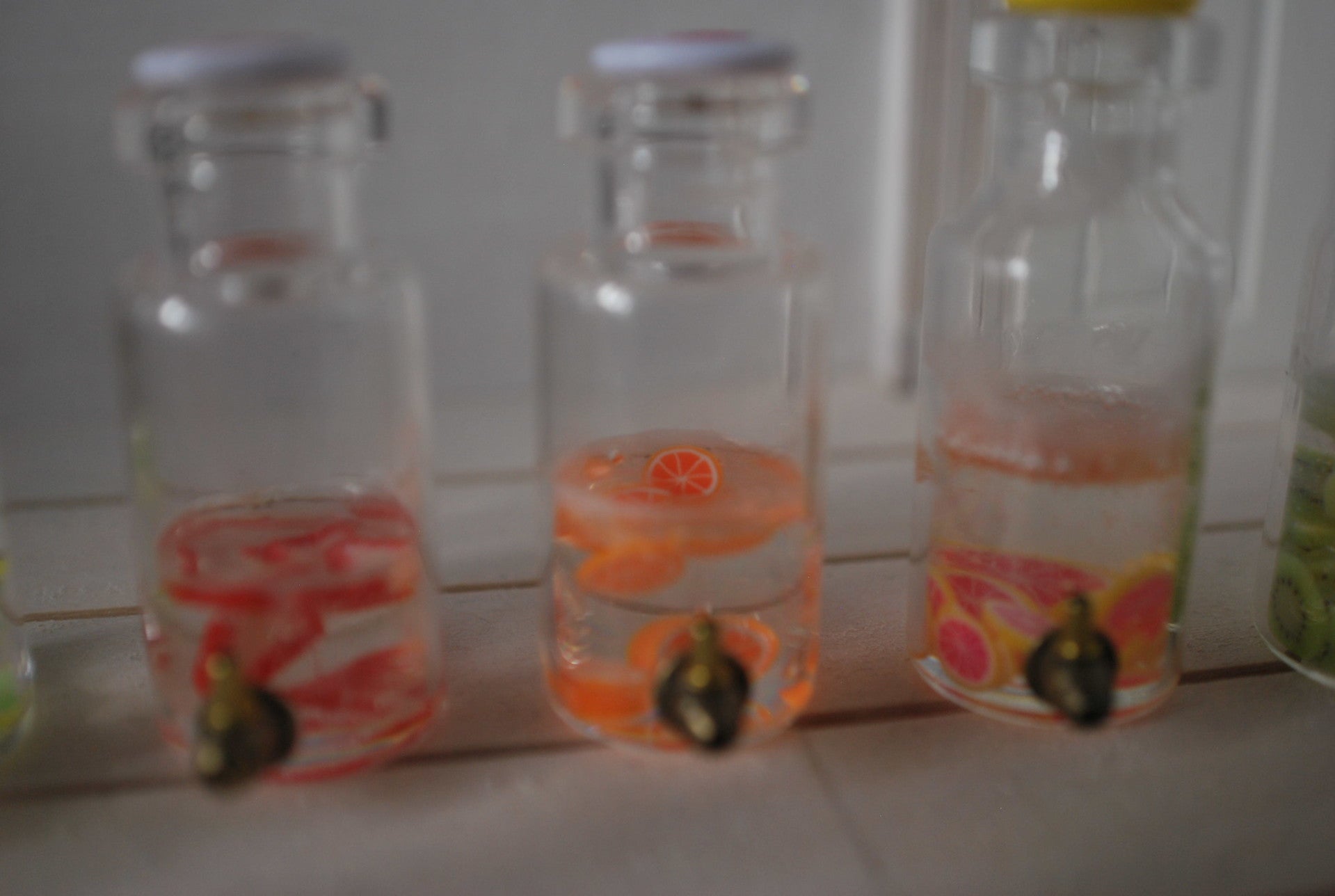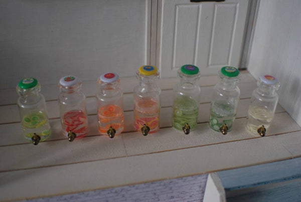 Een kan met poppenhuiswater met daarin fruit, op de kan zit een kraantje (werkt niet echt).
