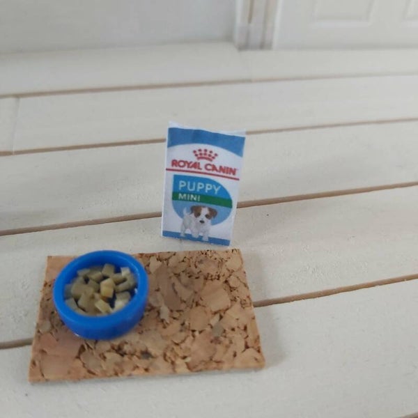 Leuk setje voor de kat of de hond, bestaande uit een kurken placemed met daarop een bakje met voer en een zakje brokjes.