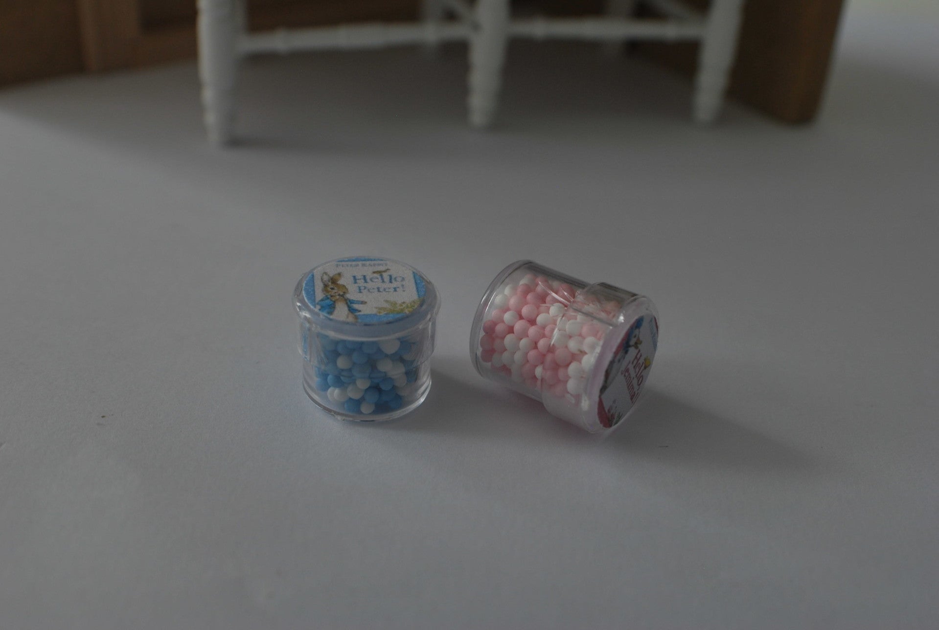 Klein kunststof potje met korreltjes erin en een plaatje erop.